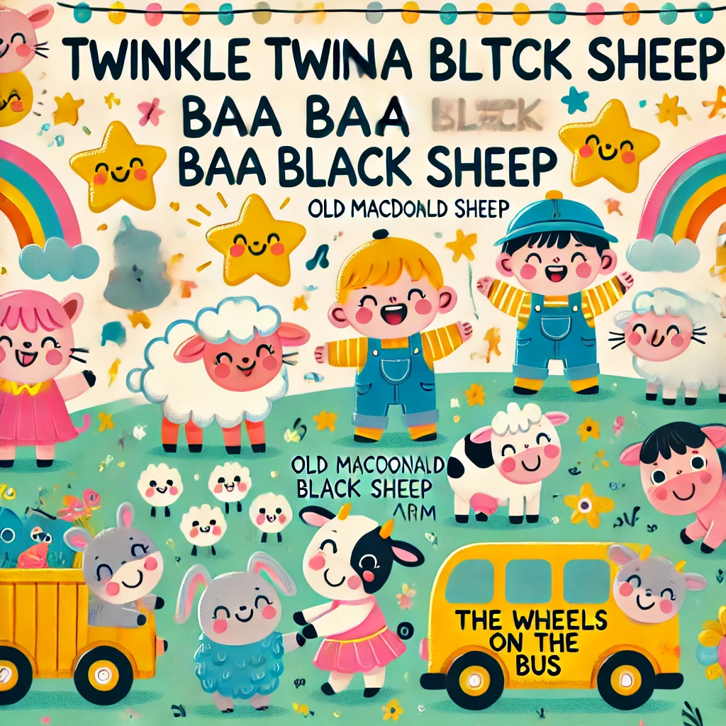 예시: Twinkle Twinkle Little Star, Baa Baa Black Sheep, Old MacDonald, Wheels on the Bus 등